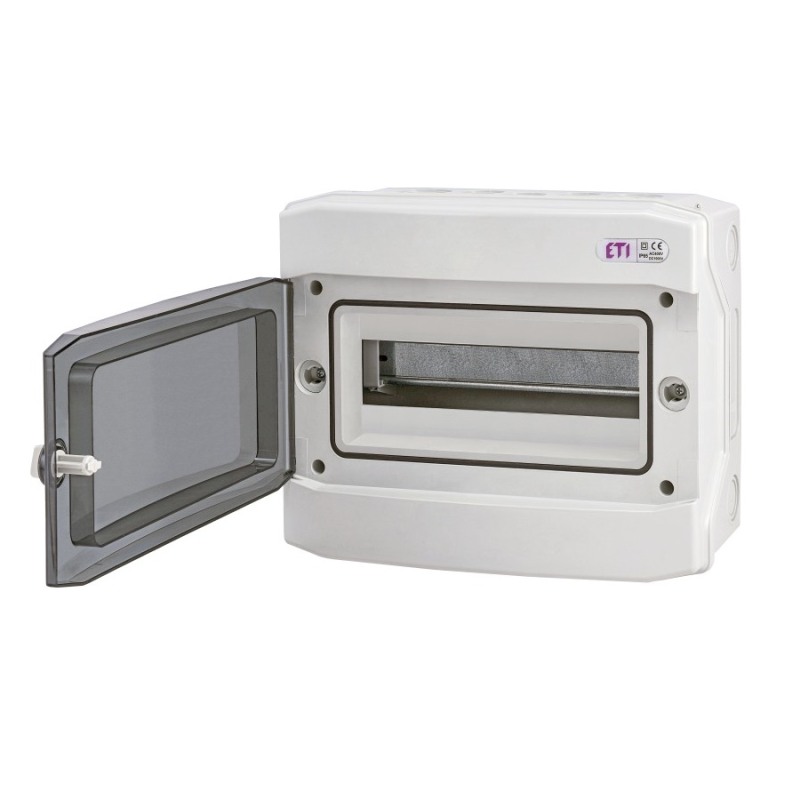 Plastová rozvodnice pro domovní elektroinstalace s průhlednými dvířky. Díky vysokému krytí je vhodná i pro venkovní použití.